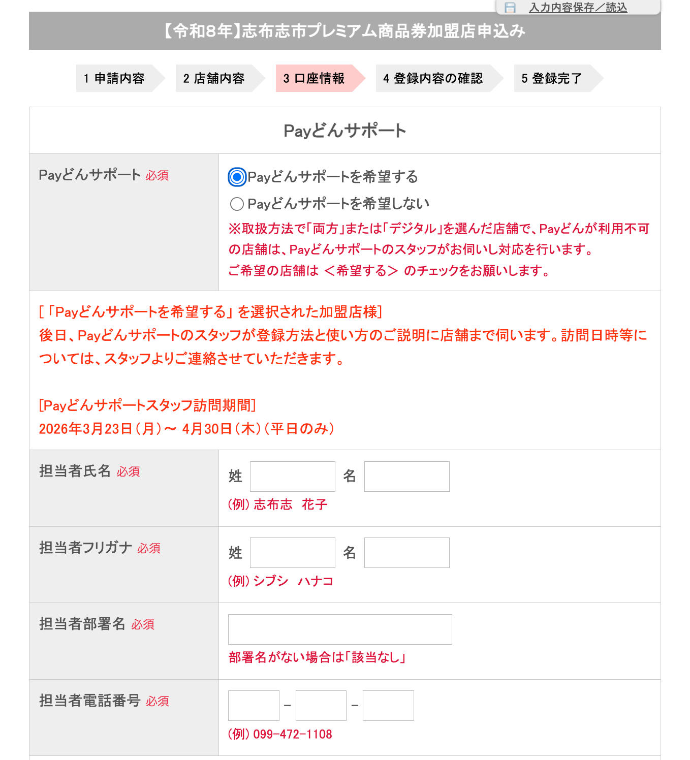 Payどんサポートを希望される場合、担当者氏名・部署名・ご連絡先等の入力をお願いします。